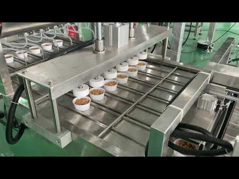Automatsko punjenje čaša ili kontejnera sa više traka, uključujući modul za zaptivanje filma. Pogodno za različite veličine, oblike i materijale kontejnera (npr. PP, PS, PET, papir, laminirane folije, itd.). Savršen za instant obroke, testenine, testenine, sušeno voće, grickalice, bombone, čokoladu, supu u prahu, smrznute obroke, jogurt, sladoled, džem itd. Automatski rad od izbacivanja čaše, punjenja do zaptivanja. Pogodan za sve vrste (odvojenih) sistema za doziranje tečnosti, paste, granule, prah itd. Jednostavno rukovanje zahvaljujući monitoru osetljivom na dodir, verziji od nerđajućeg čelika, lako se čisti. Senzor oznake pritiska. Širok spektar veličina / oblika zahvaljujući prilagodljivom koritu za kontejner. - Specifikacije: Broj numera: 2; maks. brzina ciklusa mašine u praznom hodu: 60 ciklusa / minutu; Struja: 220V, 2.6kV; Komprimovani vazduh: 0.2m³, 6bar; Dimenzije mašine: L3000kV950xH1600mm.